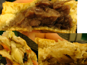 台中火車站附近,有一間口味很多的素食紅豆餅!最上面是紅豆的,左下是高麗菜,右下的蘿蔔絲,紅豆餅個頭比傳統的大,皮是比較軟像蛋糕,吃起來都還不錯,而且鹹的還有很少吃到的高麗菜哩!上面的是地瓜,下面的是奶油,本來晚餐要吃的店家,一到晚上7點就很準時的休息勒,不過晚餐以紅豆餅解決,好像也還不賴^o^