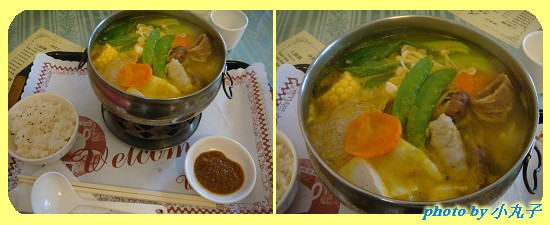 南瓜黃的湯底配上綠蔬菜紅蘿蔔整個配色很漂亮哩,